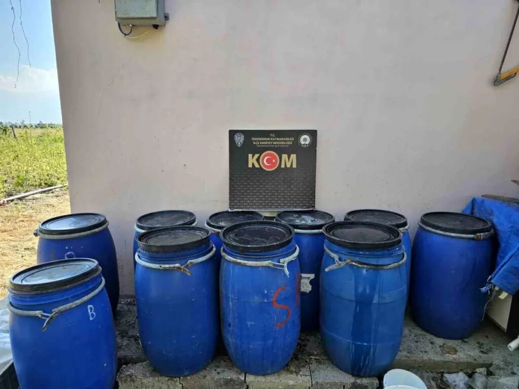 Hatay’ın Arsuz ilçesinde belirlenen 3 adreste yapılan aramada bin 35 litre geçersiz içki ile içki imalinde kullanılan gereçler ele geçirildi.